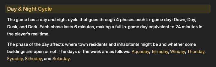 If you look in the non-concept art possessing right corner of the game: that right there is a Calendar in its most rudimentary format. The game doesn’t run on actual real-time, but NIT (Noka Island Time), in which a full day takes 24 minutes instead of 24 hours. So you don’t have to get actually bored with the mundanity of mining ore deposits and hunting creatures. The simplified “sun” and “moon” will rotate around the game’s world (implied by the shadows), the environment will change hues based on the phase, and background music will change between “Act 1 and Act 2” versions based on the daytime and evening phases: